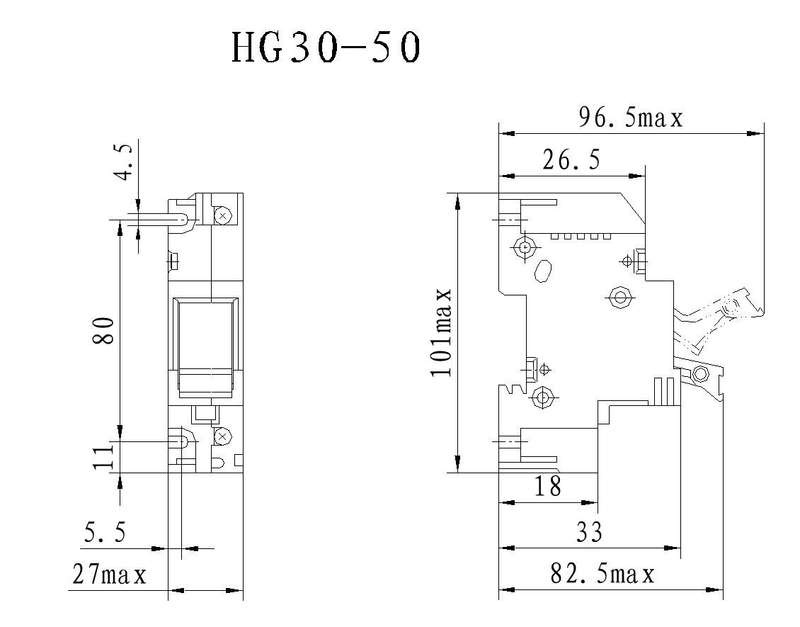 Series HG30 fuse-disconnector with rate voltage up to a.c. 400V, and rated current up to 100A is mainly used in the lighting and motor circuits as the power source isolator and for protection from overload and short-circuits. This series fuse-disconnector is composed of fuse-link and sockets, terminals, handle, and case. All live parts are enclosed in the case.